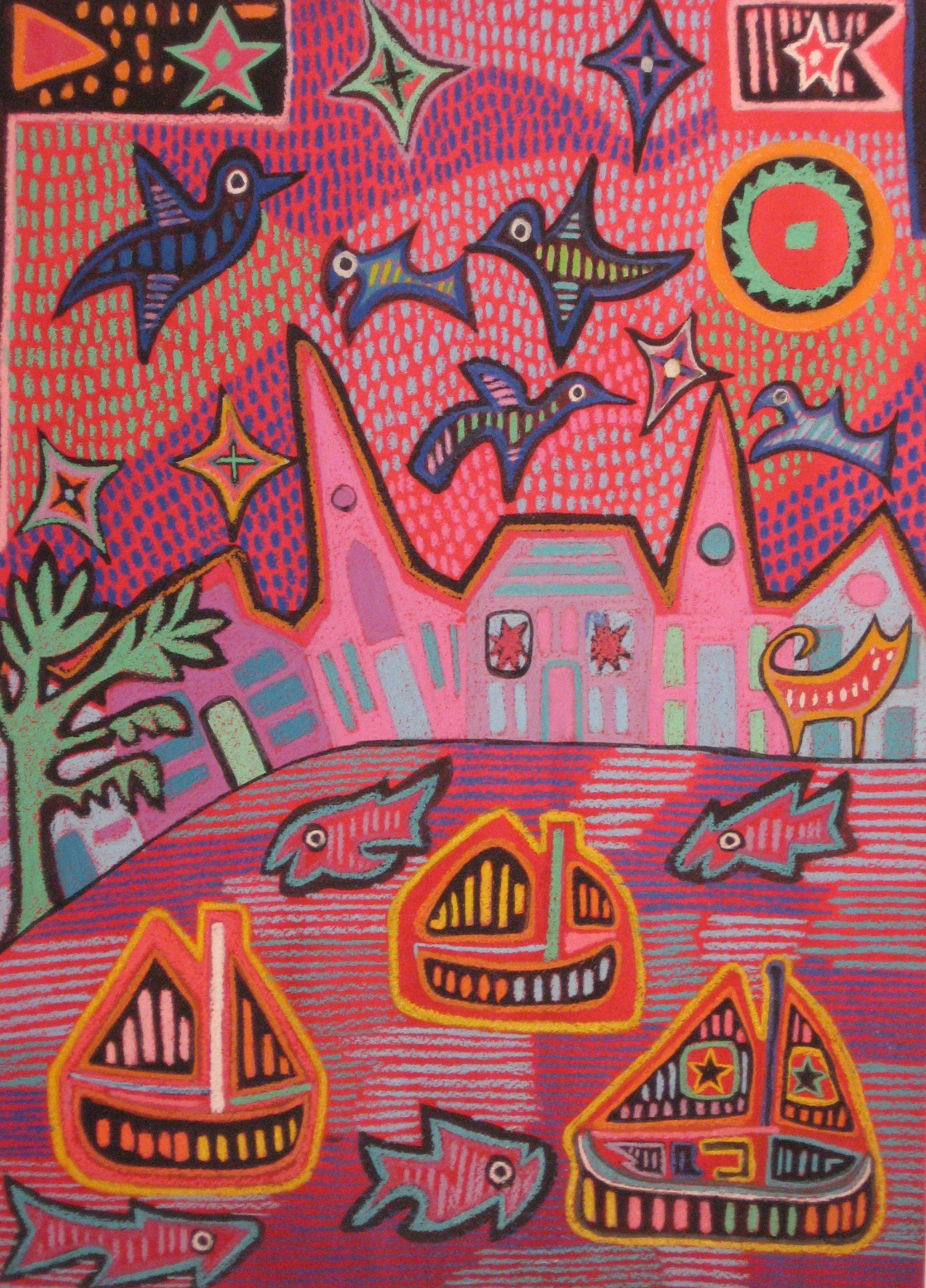 An appreciation for the textile art of the Kuna Indians are the inspiration for these mixed-media works.